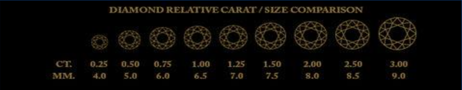 The size (in mm) of a diamond for a specific shape, is directly proportional to the carat weight of a diamond. See chart below for Round Cut as an example: